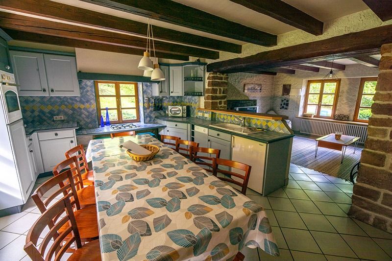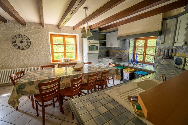 La Grande Ferme est composée d’une cuisine équipée et dinatoire ouverte sur un grand salon confortable avec cheminée à l’âtre, créant une atmosphère chaleureuse et accueillante. La cuisine est entièrement équipée pour vos repas conviviaux :