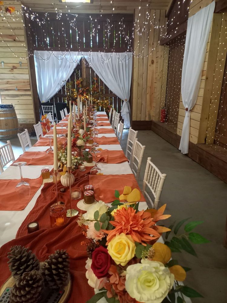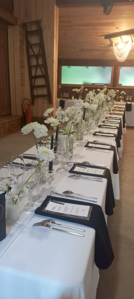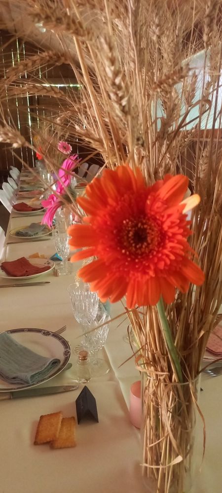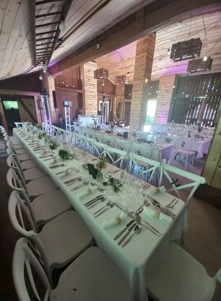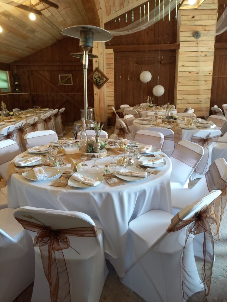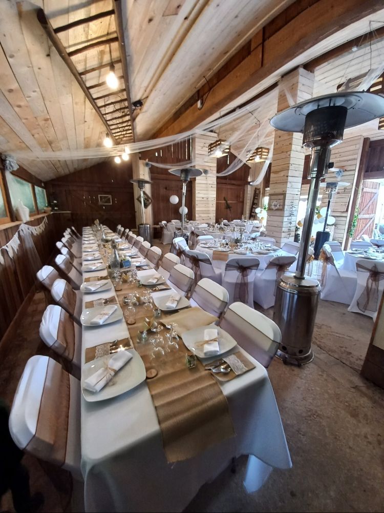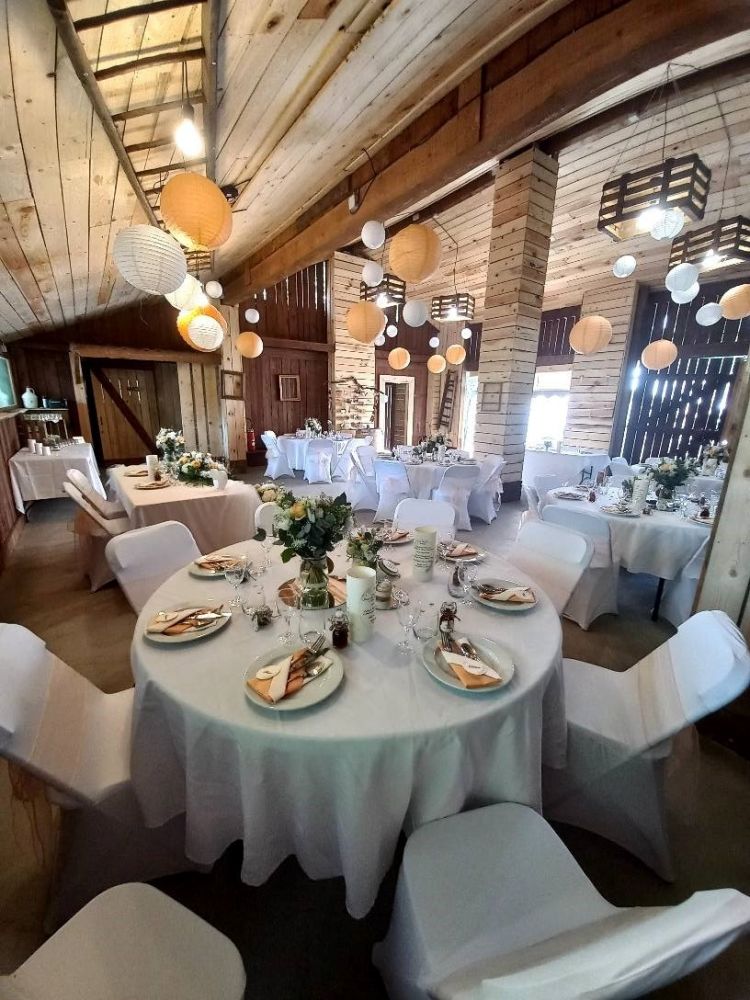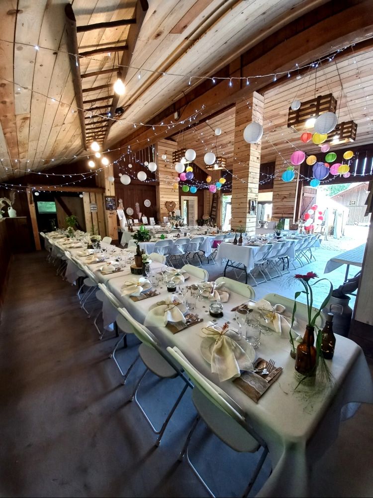 Notre grange rénovée avec soin peut accueillir jusqu’à 60 personnes pour votre réception. Son charme rustique et ses poutres apparentes créent une atmosphère intime et conviviale.